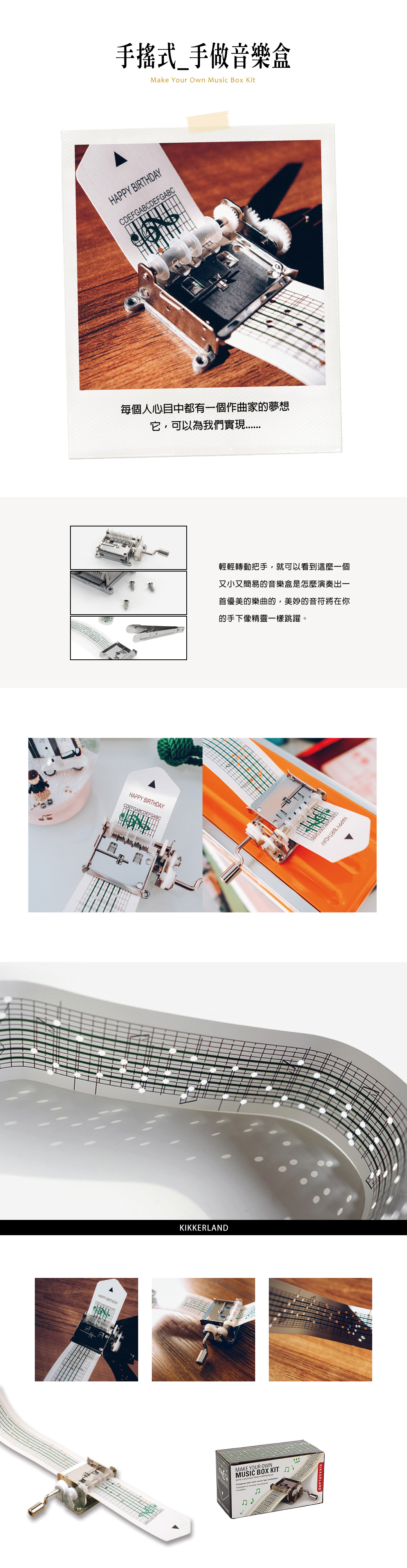 商品內容:手搖音樂盒*1、紙製樂譜*4(含已打孔*1)、打洞器*1、螺絲*3