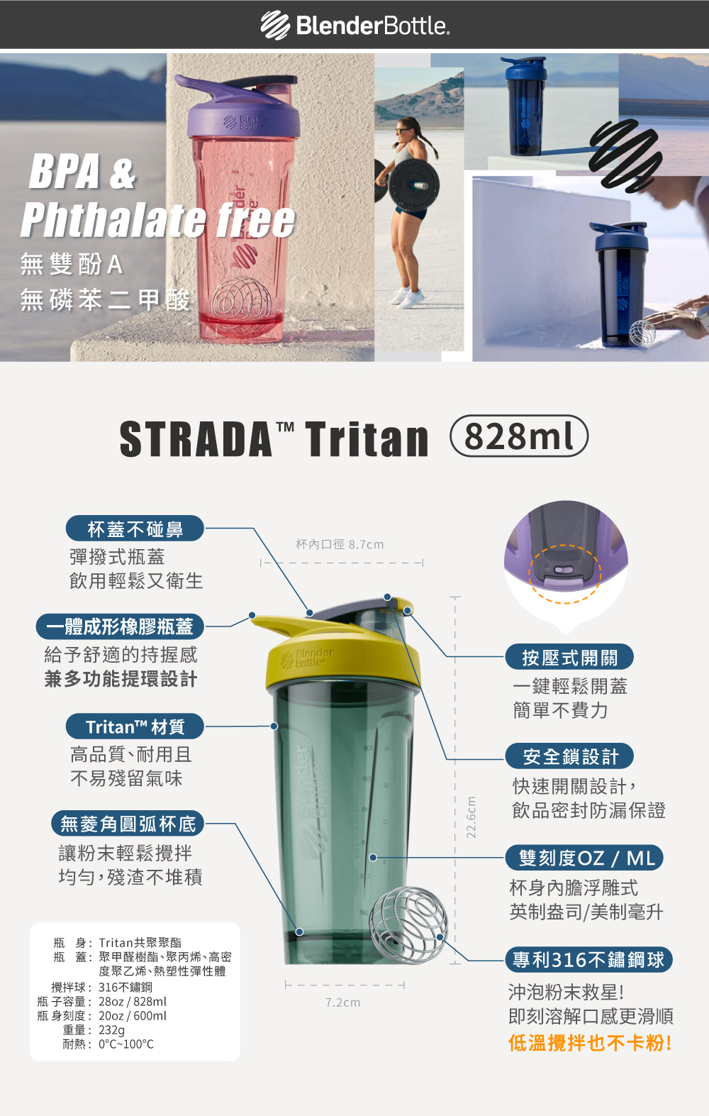 BlenderBottle《Strada系列》Tritan按壓式搖搖杯28oz/828ml